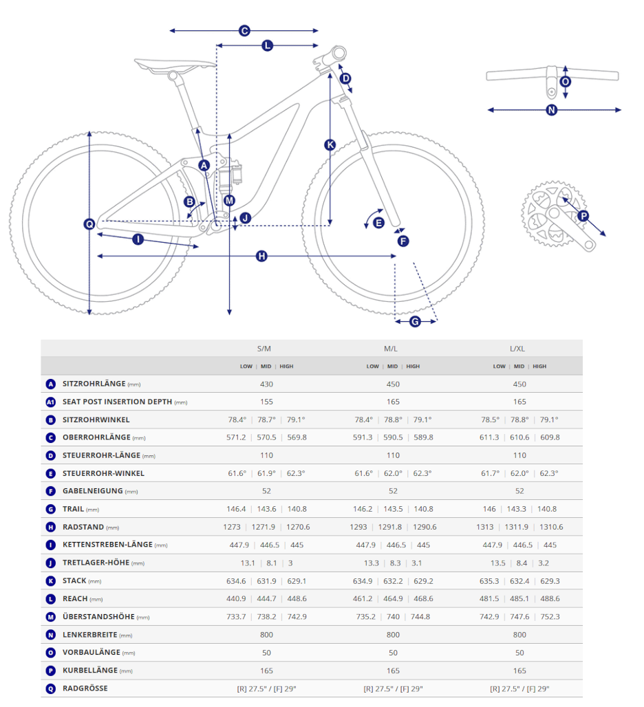 - Kurbel: TruVativ Descendent DH, 34 Zähne, 56.5mm chainline S/M:165mm, M/L:170mm, L/XL:170mm