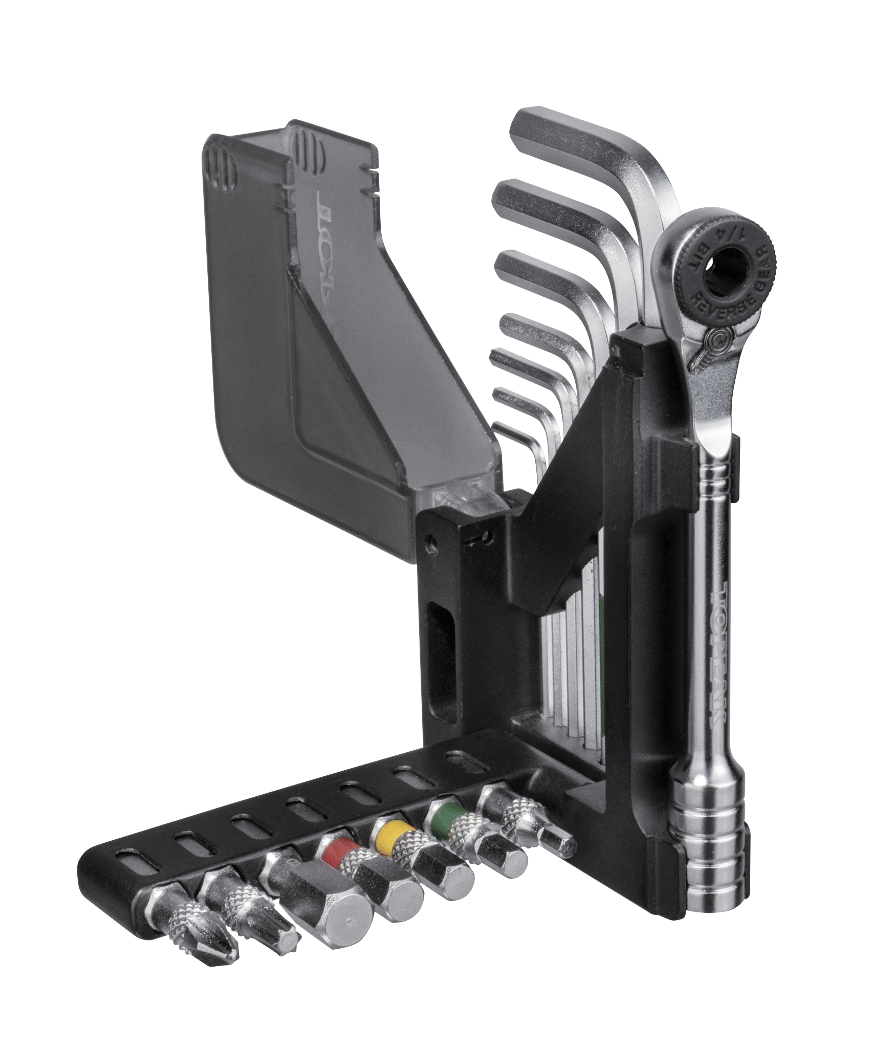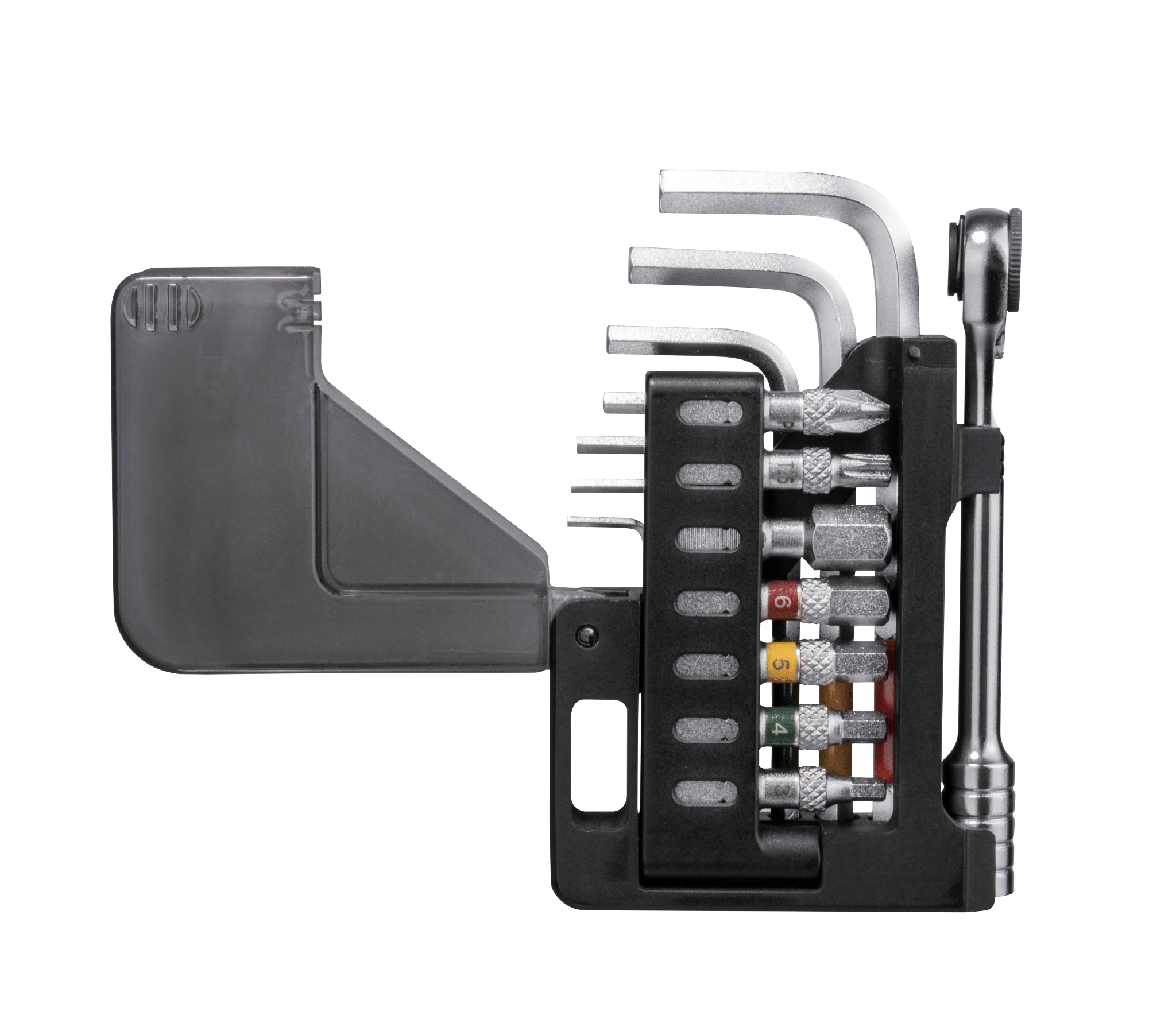 Kompakter geht es kaum. Topeak versteckt in seiner Omni ToolCard einen Ratschensatz und 7 Inbus-Schlüssel mit Kugelkopf. Das Set mit 15 Funktion ist ultraflach und passt in jede Trikot- oder Satteltasche. Die Ratsche mit farbcodierten Bits erleichtert das Schrauben und die Kugelköpfe an den Enden der Inbusschlüssel erreichen auch schwer zugängliche Stellen.