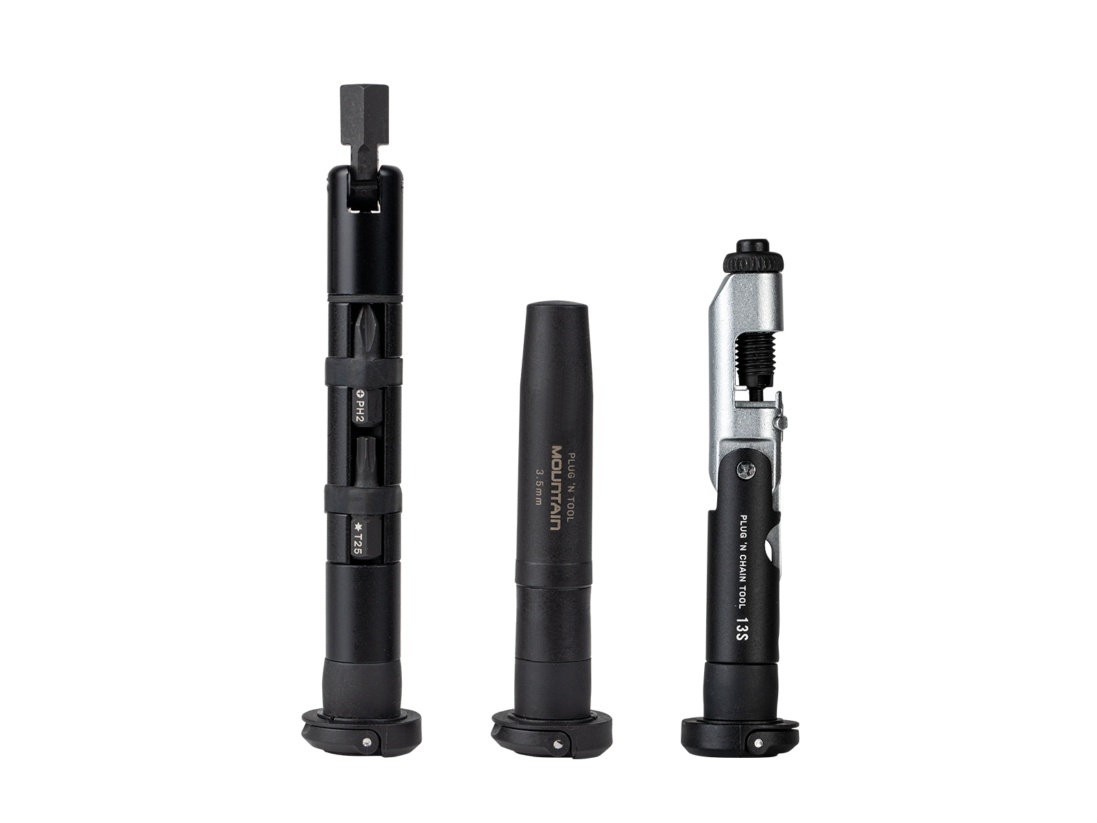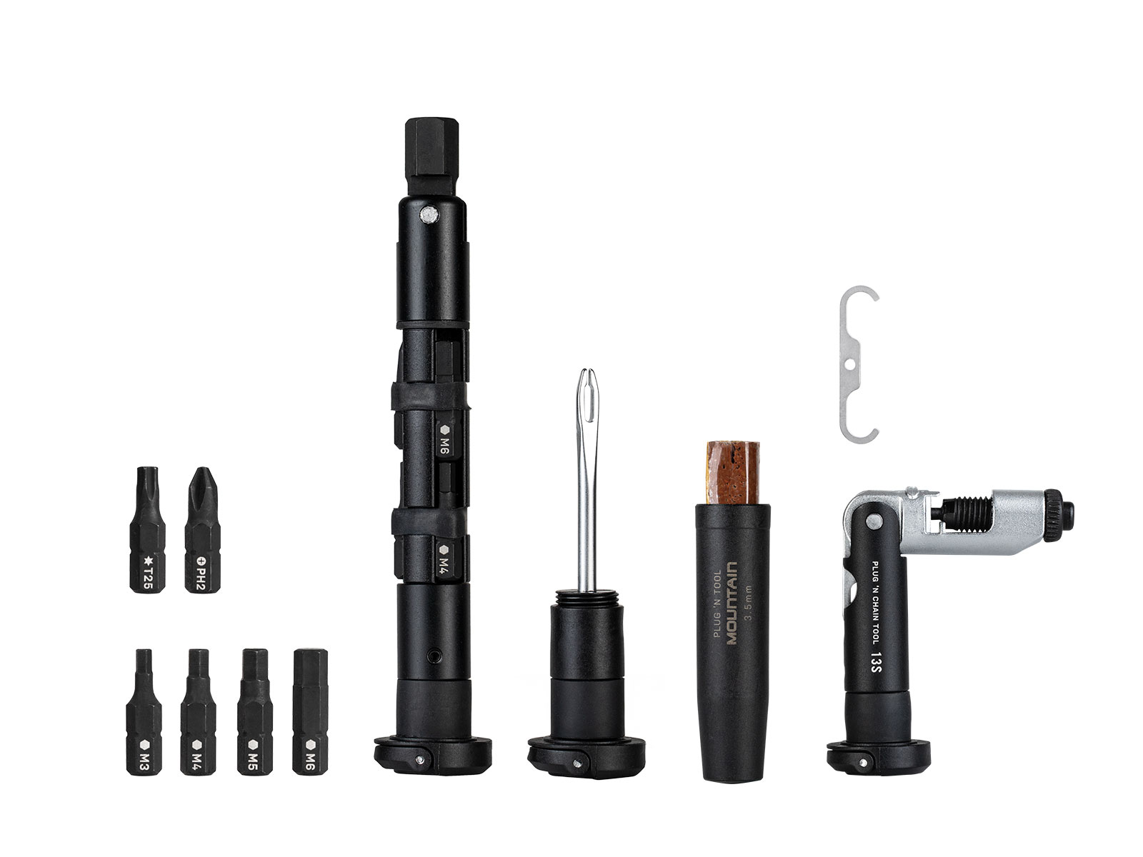 Das Topeak Plug ´n Tool Mountain Pro ist ein Set aus drei leichten und kompakten Werkzeug-Kits, mit denen du deine bevorzugte Werkzeugkombination in den Lenkerenden integrieren und fast unsichtbar verstecken kannst. So hast du alles für eine Panne bei deiner nächsten MTB-Tour dabei auch ohne lästige Tasche oder Rucksack. Die Kits enthalten ein 3.5-mm-Tubeless-Einsteckwerkzeug für schlauchlose Reifenreparaturen und ein komplettes Set mit 3 / 4 / 5 / 6 / 10-mm-Inbusbits, T25 Torx-Bit und #2 Phillips-Bit für die Fahrradwartung sowie ein zusätzliches Set bestehend aus Kettenwerkzeug mit Kettenhaken für alle Single- und Multi-Speed Ketten bis 13-fach, einschliesslich SRAM Flattop und Campagnolo Hollow Pin Ketten.