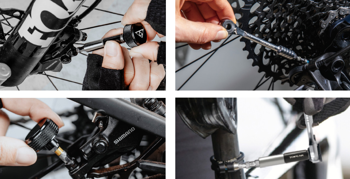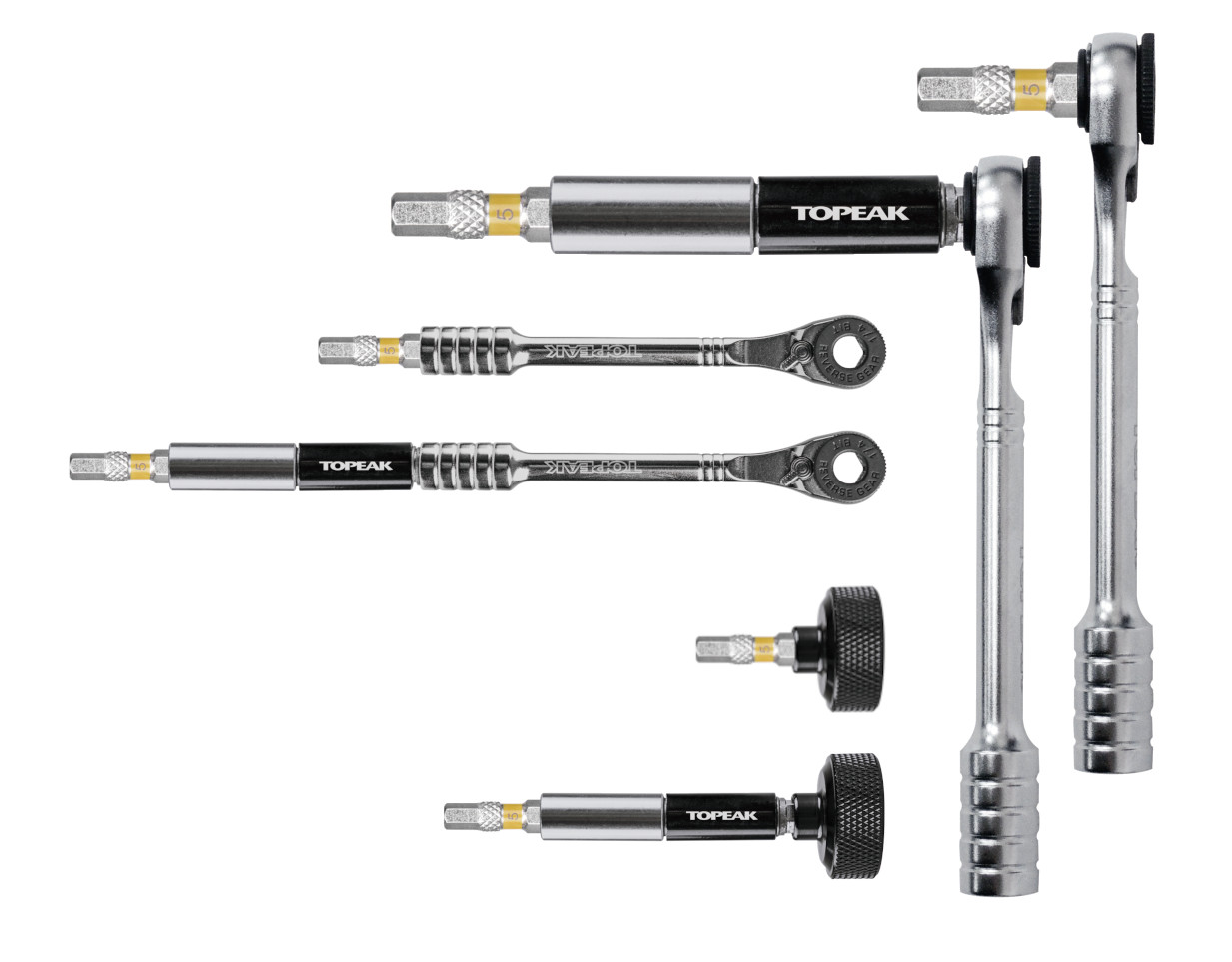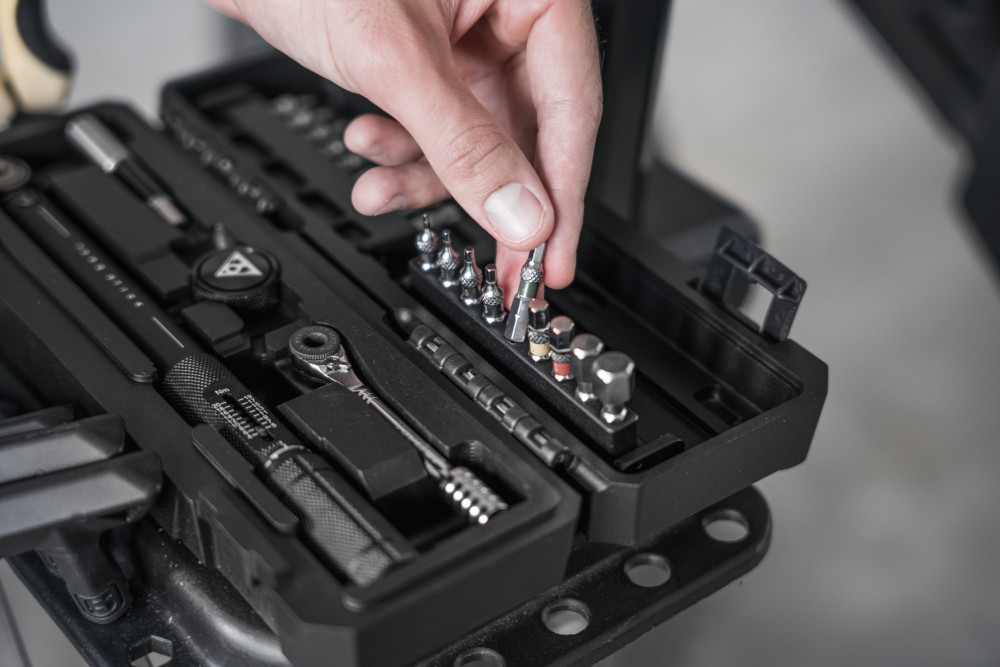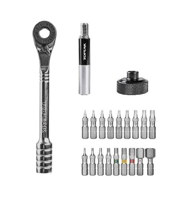 In der Topeak Torq Stich Pro Werkzeugbox findest du für alle Eventualitäten den passenden Schlüssel. Der hochwertige Drehmomentschlüssel lässt sich individuell in 0.5 Nm Schritten auf das passende Drehmoment zwischen 4 und 20 Nm einstellen. Der Torq-Stick ist mit einem umschaltbaren Ratschenkopf mit Standard-Sechskantantrieb ausgestattet. Mit dem kleineren Ratschen-Tool, ebenfalls mit Umschalter, kommst du auch an schwerzugängliche Schrauben. Der magnetische Aufsatz hält die Bits sicher an Ort und Stelle. In ganz kniffeligen Fällen leistet dir der Finger-Bit Holder gute Dienste. Alle Teile des gesamten Werkzeug-Sets finden in der stabilen Werkzeugbox ihren richtigen Platz.